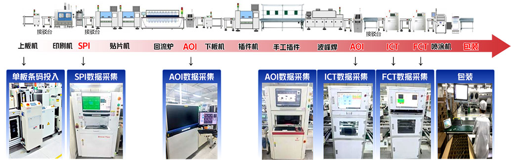 搭建智能制造平台,实现SPI、回流焊、AOI、ICT等各类生产测试设备联网,通过IOT平台实时采集设备运行状态、测试数据,实现设备在线监控管理、关键数据实时采集。